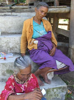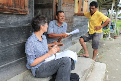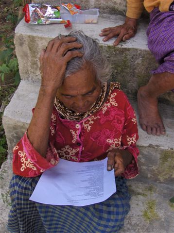 Not altogether unexpected for me was that weavers understood the text better than most other people. This is because of the many weaving terms in the text. One would learn these words only if one had some close association with weaving, e.g. if one’s mother or wife was a weaver or if one wove oneself. Young people had little or no interest in the text while elderly people enjoyed the words that they had not heard for a long time. Many of them pored over the text with rapt attention.| An elderly woman (Ny Pakpahan) in Muara read the text with rapt attention |